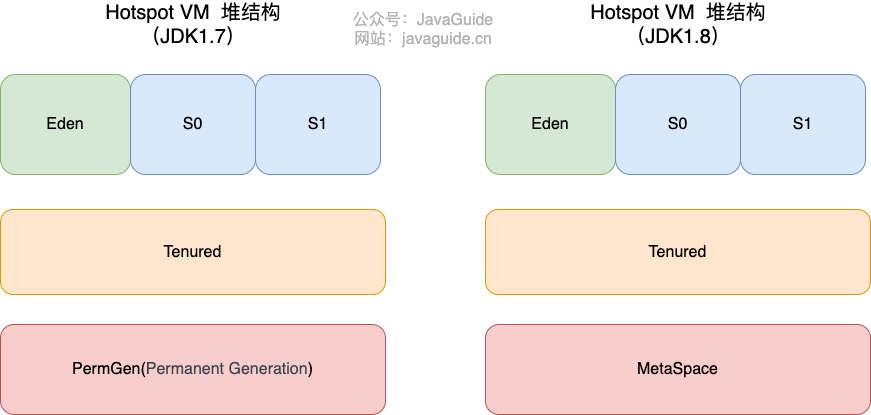 - JDK1.8 hotspot 移除了永久代用元空间(Metaspace)取而代之, 这时候字符串常量池还在堆, 运行时常量池还在方法区, 只不过方法区的实现从永久代变成了元空间(Metaspace)